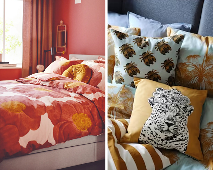 Los estampados son protagonistas en esta tendencia. Con su gran temperamento pueden cambiar en forma rotunda cualquier espacio. Los encontramos en textiles con patrones maxi en la ropa de cama, o en alfombras y tapizados de sillones. Se deben seleccionar de acuerdo al estilo del hogar y combinarlos con colores vibrantes y otros estampados. Los detalles son la clave para amalgamar la totalidad y elevar los ambientes.