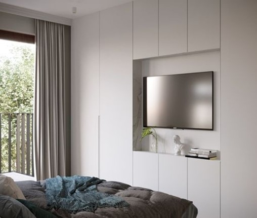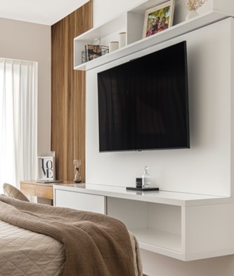 Esta opción es ideal para los dormitorios donde deben convivir en la misma pared un placar y una pantalla. Sugerimos dejar el espacio central para la TV, considerando el cableado necesario.