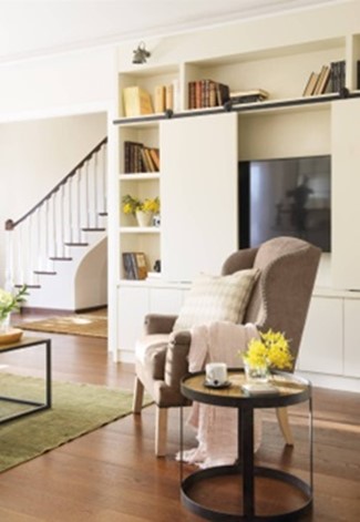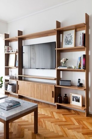 Podemos pensar en ubicar la TV en una estantería. Si tenemos libros u objetos deco, es ideal combinarlos, destinándoles un lugar en el mismo mueble. Solución ideal para espacios reducidos, con tan solo 25/30 cm de profundidad, logramos un equilibrio perfecto entre la TV y los objetos. De esta forma, armamos un entorno que acompaña y optimizamos espacios de guardado.